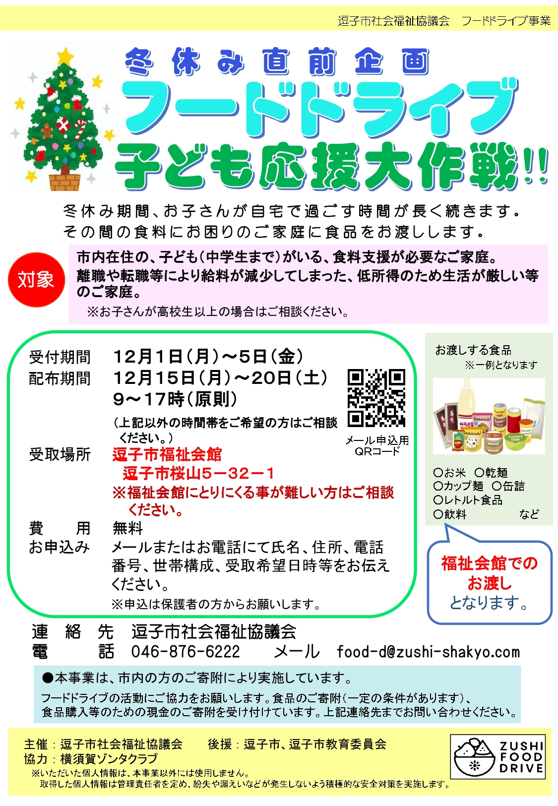 1.受付期間 12月1日(月)~12月5日(金) 2.配布期間 12月15日(月)~12月20日(土)9~17時 3.受取場所 逗子市福祉会館 3.費 用 無料 4.受 付 メールまたは電話で 5.対象者等詳細は下記チラシをご覧ください。