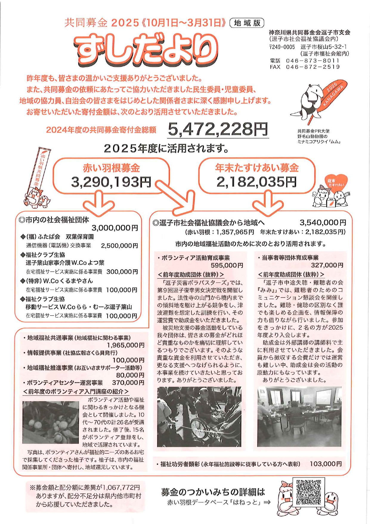 寄付金の使途は、下に添付している「ずしだより」や中央共同募金会が開設している赤い羽根データベース「はねっと」に掲載しています。